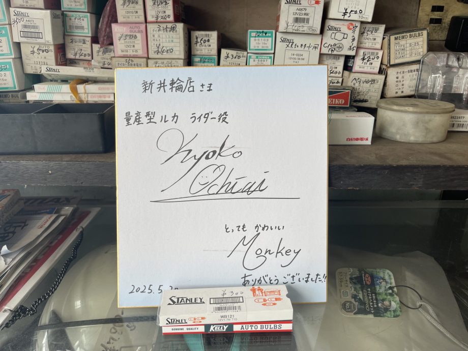 今回、お邪魔した埼玉県秩父市の下吉田にある『新井輪店』さんの店内には、第2話「ウィリーなお年頃」で出演された”量産型ルカ ライダー役の落合恭子さん”のサイン色紙が飾られていました。